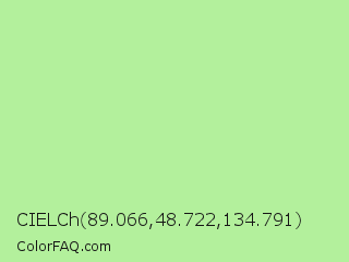 CIELCh 89.066,48.722,134.791 Color is a light green color and the nearest color is Granny Smith Apple #a8e4a0. Hex code #b3f09c and RGB value is rgb(179,240,156). In RGB color space, this color is composed of 70% red, 94% green, 61% blue, In CMYK color space, this color is composed of 25% cyan, 0% magenta, 35% yellow , 6% black , In HSL color space, this color has a hue angle of 104° , 74% saturation and 78% lightness.