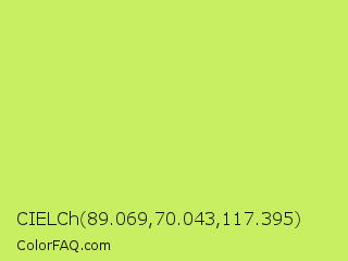 CIELCh 89.069,70.043,117.395 Color is a light lime color and the nearest color is Inchworm #b2ec5d. Hex code #c8ee62 and RGB value is rgb(200,238,98). In RGB color space, this color is composed of 78% red, 93% green, 38% blue, In CMYK color space, this color is composed of 16% cyan, 0% magenta, 59% yellow , 7% black , In HSL color space, this color has a hue angle of 76° , 80% saturation and 66% lightness.