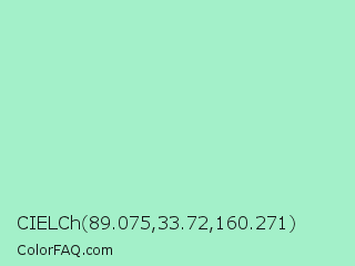 CIELCh 89.075,33.72,160.271 Color is a light green color and the nearest color is Magic Mint #aaf0d1. Hex code #a3f0c9 and RGB value is rgb(163,240,201). In RGB color space, this color is composed of 64% red, 94% green, 79% blue, In CMYK color space, this color is composed of 32% cyan, 0% magenta, 16% yellow , 6% black , In HSL color space, this color has a hue angle of 150° , 72% saturation and 79% lightness.