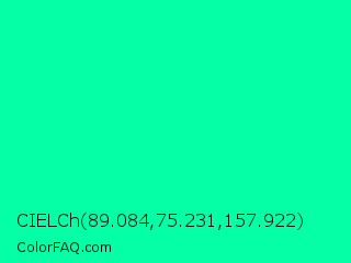 CIELCh 89.084,75.231,157.922 Color is a normal green color and the nearest color is Medium Spring Green #00fa9a. Hex code #05ffa7 and RGB value is rgb(5,255,167). In RGB color space, this color is composed of 2% red, 100% green, 65% blue, In CMYK color space, this color is composed of 98% cyan, 0% magenta, 35% yellow , 0% black , In HSL color space, this color has a hue angle of 159° , 100% saturation and 51% lightness.