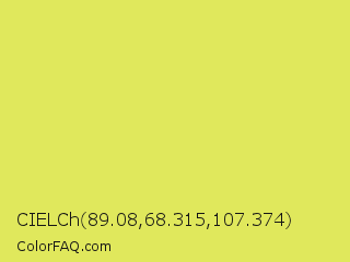 CIELCh 89.08,68.315,107.374 Color is a light yellow color and the nearest color is Maximum Green Yellow #d9e650. Hex code #e0e85c and RGB value is rgb(224,232,92). In RGB color space, this color is composed of 88% red, 91% green, 36% blue, In CMYK color space, this color is composed of 3% cyan, 0% magenta, 60% yellow , 9% black , In HSL color space, this color has a hue angle of 63° , 75% saturation and 64% lightness.