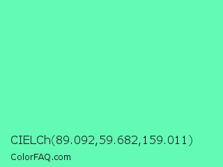 CIELCh 89.092,59.682,159.011 Color is a light green color and the nearest color is Medium Aquamarine #66ddaa. Hex code #63fab5 and RGB value is rgb(99,250,181). In RGB color space, this color is composed of 39% red, 98% green, 71% blue, In CMYK color space, this color is composed of 60% cyan, 0% magenta, 28% yellow , 2% black , In HSL color space, this color has a hue angle of 153° , 94% saturation and 68% lightness.