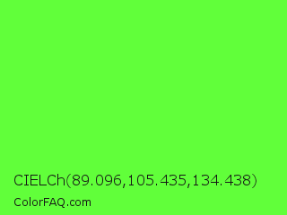 CIELCh 89.096,105.435,134.438 Color is a light green color and the nearest color is Spring Frost #87ff2a. Hex code #61ff3a and RGB value is rgb(97,255,58). In RGB color space, this color is composed of 38% red, 100% green, 23% blue, In CMYK color space, this color is composed of 62% cyan, 0% magenta, 77% yellow , 0% black , In HSL color space, this color has a hue angle of 108° , 100% saturation and 61% lightness.