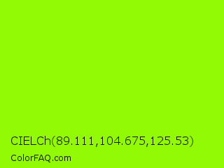 CIELCh 89.111,104.675,125.53 Color is a normal green color and the nearest color is Chartreuse #7fff00. Hex code #91fa04 and RGB value is rgb(145,250,4). In RGB color space, this color is composed of 57% red, 98% green, 2% blue, In CMYK color space, this color is composed of 42% cyan, 0% magenta, 98% yellow , 2% black , In HSL color space, this color has a hue angle of 86° , 97% saturation and 50% lightness.