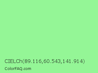 CIELCh 89.116,60.543,141.914 Color is a light green color and the nearest color is Pale Green #98fb98. Hex code #94f696 and RGB value is rgb(148,246,150). In RGB color space, this color is composed of 58% red, 96% green, 59% blue, In CMYK color space, this color is composed of 40% cyan, 0% magenta, 39% yellow , 4% black , In HSL color space, this color has a hue angle of 121° , 84% saturation and 77% lightness.