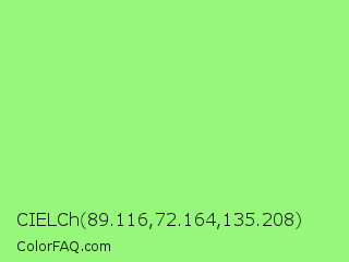 CIELCh 89.116,72.164,135.208 Color is a light green color and the nearest color is Light Green #90ee90. Hex code #96f77a and RGB value is rgb(150,247,122). In RGB color space, this color is composed of 59% red, 97% green, 48% blue, In CMYK color space, this color is composed of 39% cyan, 0% magenta, 51% yellow , 3% black , In HSL color space, this color has a hue angle of 107° , 89% saturation and 72% lightness.