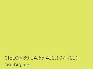 CIELCh 89.14,65.412,107.721 Color is a light yellow color and the nearest color is Booger Buster #dde26a. Hex code #e0e863 and RGB value is rgb(224,232,99). In RGB color space, this color is composed of 88% red, 91% green, 39% blue, In CMYK color space, this color is composed of 3% cyan, 0% magenta, 57% yellow , 9% black , In HSL color space, this color has a hue angle of 64° , 74% saturation and 65% lightness.