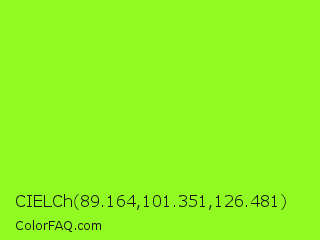 CIELCh 89.164,101.351,126.481 Color is a normal green color and the nearest color is Spring Frost #87ff2a. Hex code #91fa23 and RGB value is rgb(145,250,35). In RGB color space, this color is composed of 57% red, 98% green, 14% blue, In CMYK color space, this color is composed of 42% cyan, 0% magenta, 86% yellow , 2% black , In HSL color space, this color has a hue angle of 89° , 96% saturation and 56% lightness.