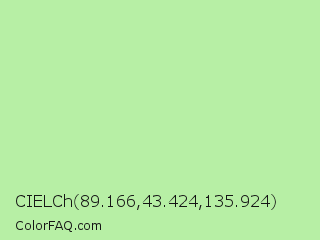 CIELCh 89.166,43.424,135.924 Color is a light green color and the nearest color is Granny Smith Apple #a8e4a0. Hex code #b7efa5 and RGB value is rgb(183,239,165). In RGB color space, this color is composed of 72% red, 94% green, 65% blue, In CMYK color space, this color is composed of 23% cyan, 0% magenta, 31% yellow , 6% black , In HSL color space, this color has a hue angle of 105° , 70% saturation and 79% lightness.