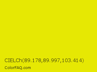 CIELCh 89.178,89.997,103.414 Color is a normal yellow color and the nearest color is Peridot #e6e200. Hex code #e6e803 and RGB value is rgb(230,232,3). In RGB color space, this color is composed of 90% red, 91% green, 1% blue, In CMYK color space, this color is composed of 1% cyan, 0% magenta, 99% yellow , 9% black , In HSL color space, this color has a hue angle of 61° , 97% saturation and 46% lightness.