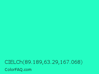 CIELCh 89.189,63.29,167.068 Color is a normal cyan color and the nearest color is Turquoise PWG #30d5c8. Hex code #24fdc3 and RGB value is rgb(36,253,195). In RGB color space, this color is composed of 14% red, 99% green, 76% blue, In CMYK color space, this color is composed of 86% cyan, 0% magenta, 23% yellow , 1% black , In HSL color space, this color has a hue angle of 164° , 98% saturation and 57% lightness.