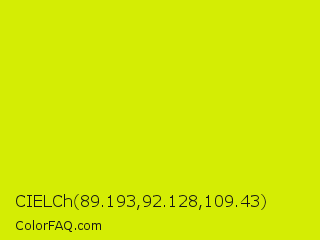 CIELCh 89.193,92.128,109.43 Color is a normal yellow color and the nearest color is Bitter Lemon #cae00d. Hex code #d4ed04 and RGB value is rgb(212,237,4). In RGB color space, this color is composed of 83% red, 93% green, 2% blue, In CMYK color space, this color is composed of 11% cyan, 0% magenta, 98% yellow , 7% black , In HSL color space, this color has a hue angle of 66° , 97% saturation and 47% lightness.