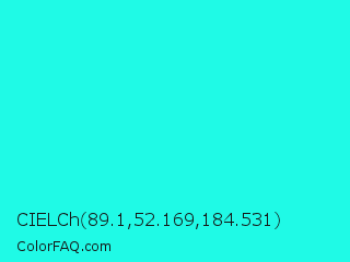 CIELCh 89.1,52.169,184.531 Color is a normal cyan color and the nearest color is Loeen #15f2fd. Hex code #1ffae6 and RGB value is rgb(31,250,230). In RGB color space, this color is composed of 12% red, 98% green, 90% blue, In CMYK color space, this color is composed of 88% cyan, 0% magenta, 8% yellow , 2% black , In HSL color space, this color has a hue angle of 175° , 96% saturation and 55% lightness.
