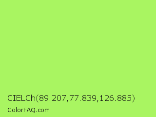 CIELCh 89.207,77.839,126.885 Color is a light green color and the nearest color is Inchworm #b2ec5d. Hex code #a9f561 and RGB value is rgb(169,245,97). In RGB color space, this color is composed of 66% red, 96% green, 38% blue, In CMYK color space, this color is composed of 31% cyan, 0% magenta, 60% yellow , 4% black , In HSL color space, this color has a hue angle of 91° , 88% saturation and 67% lightness.