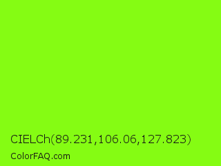 CIELCh 89.231,106.06,127.823 Color is a normal green color and the nearest color is Chartreuse #7fff00. Hex code #85fc13 and RGB value is rgb(133,252,19). In RGB color space, this color is composed of 52% red, 99% green, 7% blue, In CMYK color space, this color is composed of 47% cyan, 0% magenta, 92% yellow , 1% black , In HSL color space, this color has a hue angle of 91° , 97% saturation and 53% lightness.