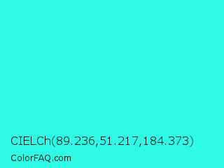 CIELCh 89.236,51.217,184.373 Color is a normal cyan color and the nearest color is Loeen #15f2fd. Hex code #2efae6 and RGB value is rgb(46,250,230). In RGB color space, this color is composed of 18% red, 98% green, 90% blue, In CMYK color space, this color is composed of 82% cyan, 0% magenta, 8% yellow , 2% black , In HSL color space, this color has a hue angle of 174° , 95% saturation and 58% lightness.