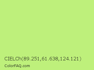 CIELCh 89.251,61.638,124.121 Color is a light green color and the nearest color is Sulu #c1f07c. Hex code #bef07b and RGB value is rgb(190,240,123). In RGB color space, this color is composed of 75% red, 94% green, 48% blue, In CMYK color space, this color is composed of 21% cyan, 0% magenta, 49% yellow , 6% black , In HSL color space, this color has a hue angle of 86° , 80% saturation and 71% lightness.