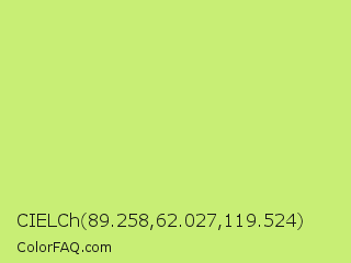 CIELCh 89.258,62.027,119.524 Color is a light lime color and the nearest color is Sulu #c1f07c. Hex code #c8ee75 and RGB value is rgb(200,238,117). In RGB color space, this color is composed of 78% red, 93% green, 46% blue, In CMYK color space, this color is composed of 16% cyan, 0% magenta, 51% yellow , 7% black , In HSL color space, this color has a hue angle of 79° , 78% saturation and 70% lightness.