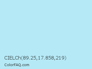 CIELCh 89.25,17.858,219 Color is a very light cyan color and the nearest color is Charlotte #baeef9. Hex code #b5e9f5 and RGB value is rgb(181,233,245). In RGB color space, this color is composed of 71% red, 91% green, 96% blue, In CMYK color space, this color is composed of 26% cyan, 5% magenta, 0% yellow , 4% black , In HSL color space, this color has a hue angle of 191° , 76% saturation and 84% lightness.