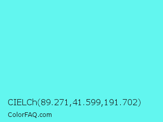 CIELCh 89.271,41.599,191.702 Color is a light cyan color and the nearest color is Turquoise Blue #6cdae7. Hex code #62f6ef and RGB value is rgb(98,246,239). In RGB color space, this color is composed of 38% red, 96% green, 94% blue, In CMYK color space, this color is composed of 60% cyan, 0% magenta, 3% yellow , 4% black , In HSL color space, this color has a hue angle of 177° , 89% saturation and 67% lightness.
