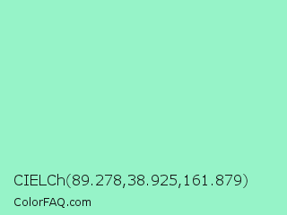 CIELCh 89.278,38.925,161.879 Color is a light green color and the nearest color is Sea Foam Green #9fe2bf. Hex code #96f3c8 and RGB value is rgb(150,243,200). In RGB color space, this color is composed of 59% red, 95% green, 78% blue, In CMYK color space, this color is composed of 38% cyan, 0% magenta, 18% yellow , 5% black , In HSL color space, this color has a hue angle of 152° , 79% saturation and 77% lightness.