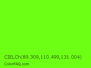 CIELCh 89.309,110.499,131.004 Color is a normal green color and the nearest color is Bright Green #66ff00. Hex code #6dff14 and RGB value is rgb(109,255,20). In RGB color space, this color is composed of 43% red, 100% green, 8% blue, In CMYK color space, this color is composed of 57% cyan, 0% magenta, 92% yellow , 0% black , In HSL color space, this color has a hue angle of 97° , 100% saturation and 54% lightness.