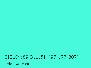 CIELCh 89.311,51.497,177.807 Color is a light cyan color and the nearest color is Turquoise #40e0d0. Hex code #47fadb and RGB value is rgb(71,250,219). In RGB color space, this color is composed of 28% red, 98% green, 86% blue, In CMYK color space, this color is composed of 72% cyan, 0% magenta, 12% yellow , 2% black , In HSL color space, this color has a hue angle of 170° , 95% saturation and 63% lightness.