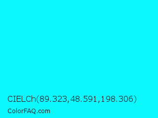 CIELCh 89.323,48.591,198.306 Color is a normal cyan color and the nearest color is Loeen #15f2fd. Hex code #0bf9fc and RGB value is rgb(11,249,252). In RGB color space, this color is composed of 4% red, 98% green, 99% blue, In CMYK color space, this color is composed of 96% cyan, 1% magenta, 0% yellow , 1% black , In HSL color space, this color has a hue angle of 181° , 98% saturation and 52% lightness.