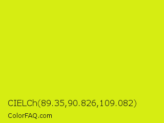 CIELCh 89.35,90.826,109.082 Color is a normal yellow color and the nearest color is Piss Yellow #e1e115. Hex code #d6ed12 and RGB value is rgb(214,237,18). In RGB color space, this color is composed of 84% red, 93% green, 7% blue, In CMYK color space, this color is composed of 10% cyan, 0% magenta, 92% yellow , 7% black , In HSL color space, this color has a hue angle of 66° , 86% saturation and 50% lightness.