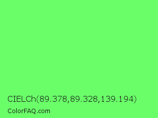 CIELCh 89.378,89.328,139.194 Color is a light green color and the nearest color is Screamin Green #66ff66. Hex code #6afe69 and RGB value is rgb(106,254,105). In RGB color space, this color is composed of 42% red, 100% green, 41% blue, In CMYK color space, this color is composed of 58% cyan, 0% magenta, 59% yellow , 0% black , In HSL color space, this color has a hue angle of 120° , 99% saturation and 70% lightness.