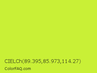 CIELCh 89.395,85.973,114.27 Color is a normal lime color and the nearest color is Pear #d1e231. Hex code #c9f036 and RGB value is rgb(201,240,54). In RGB color space, this color is composed of 79% red, 94% green, 21% blue, In CMYK color space, this color is composed of 16% cyan, 0% magenta, 78% yellow , 6% black , In HSL color space, this color has a hue angle of 73° , 86% saturation and 58% lightness.