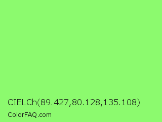 CIELCh 89.427,80.128,135.108 Color is a light green color and the nearest color is Light Green #90ee90. Hex code #8cfa6e and RGB value is rgb(140,250,110). In RGB color space, this color is composed of 55% red, 98% green, 43% blue, In CMYK color space, this color is composed of 44% cyan, 0% magenta, 56% yellow , 2% black , In HSL color space, this color has a hue angle of 107° , 93% saturation and 71% lightness.