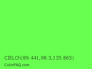 CIELCh 89.441,98.3,135.865 Color is a light green color and the nearest color is Screamin Green #66ff66. Hex code #69ff50 and RGB value is rgb(105,255,80). In RGB color space, this color is composed of 41% red, 100% green, 31% blue, In CMYK color space, this color is composed of 59% cyan, 0% magenta, 69% yellow , 0% black , In HSL color space, this color has a hue angle of 111° , 100% saturation and 66% lightness.