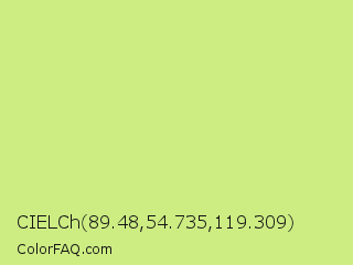 CIELCh 89.48,54.735,119.309 Color is a light lime color and the nearest color is Sulu #c1f07c. Hex code #cded83 and RGB value is rgb(205,237,131). In RGB color space, this color is composed of 80% red, 93% green, 51% blue, In CMYK color space, this color is composed of 14% cyan, 0% magenta, 45% yellow , 7% black , In HSL color space, this color has a hue angle of 78° , 75% saturation and 72% lightness.
