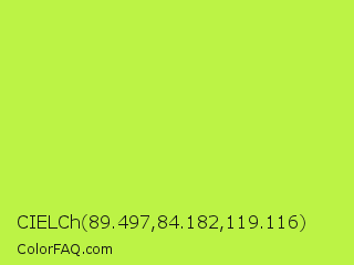 CIELCh 89.497,84.182,119.116 Color is a light lime color and the nearest color is Inchworm #b2ec5d. Hex code #bcf345 and RGB value is rgb(188,243,69). In RGB color space, this color is composed of 74% red, 95% green, 27% blue, In CMYK color space, this color is composed of 23% cyan, 0% magenta, 72% yellow , 5% black , In HSL color space, this color has a hue angle of 79° , 88% saturation and 61% lightness.