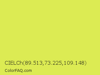 CIELCh 89.513,73.225,109.148 Color is a light yellow color and the nearest color is Maximum Green Yellow #d9e650. Hex code #dceb53 and RGB value is rgb(220,235,83). In RGB color space, this color is composed of 86% red, 92% green, 33% blue, In CMYK color space, this color is composed of 6% cyan, 0% magenta, 65% yellow , 8% black , In HSL color space, this color has a hue angle of 66° , 79% saturation and 62% lightness.