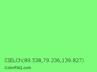CIELCh 89.538,79.236,139.827 Color is a light green color and the nearest color is Screamin Green #66ff66. Hex code #7cfc7a and RGB value is rgb(124,252,122). In RGB color space, this color is composed of 49% red, 99% green, 48% blue, In CMYK color space, this color is composed of 51% cyan, 0% magenta, 52% yellow , 1% black , In HSL color space, this color has a hue angle of 119° , 96% saturation and 73% lightness.