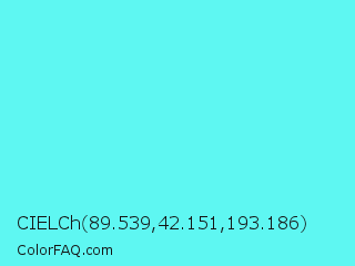 CIELCh 89.539,42.151,193.186 Color is a light cyan color and the nearest color is Electric Blue #7df9ff. Hex code #5ef7f2 and RGB value is rgb(94,247,242). In RGB color space, this color is composed of 37% red, 97% green, 95% blue, In CMYK color space, this color is composed of 62% cyan, 0% magenta, 2% yellow , 3% black , In HSL color space, this color has a hue angle of 178° , 91% saturation and 67% lightness.