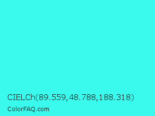 CIELCh 89.559,48.788,188.318 Color is a normal cyan color and the nearest color is Turquoise #40e0d0. Hex code #39faed and RGB value is rgb(57,250,237). In RGB color space, this color is composed of 22% red, 98% green, 93% blue, In CMYK color space, this color is composed of 77% cyan, 0% magenta, 5% yellow , 2% black , In HSL color space, this color has a hue angle of 176° , 95% saturation and 60% lightness.