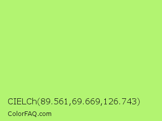 CIELCh 89.561,69.669,126.743 Color is a light green color and the nearest color is Sulu #c1f07c. Hex code #b2f471 and RGB value is rgb(178,244,113). In RGB color space, this color is composed of 70% red, 96% green, 44% blue, In CMYK color space, this color is composed of 27% cyan, 0% magenta, 54% yellow , 4% black , In HSL color space, this color has a hue angle of 90° , 86% saturation and 70% lightness.