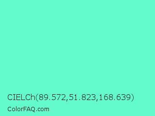 CIELCh 89.572,51.823,168.639 Color is a light green color and the nearest color is Aquamarine #7fffd4. Hex code #63facc and RGB value is rgb(99,250,204). In RGB color space, this color is composed of 39% red, 98% green, 80% blue, In CMYK color space, this color is composed of 60% cyan, 0% magenta, 18% yellow , 2% black , In HSL color space, this color has a hue angle of 162° , 94% saturation and 68% lightness.