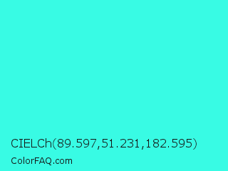 CIELCh 89.597,51.231,182.595 Color is a normal cyan color and the nearest color is Turquoise #40e0d0. Hex code #38fbe4 and RGB value is rgb(56,251,228). In RGB color space, this color is composed of 22% red, 98% green, 89% blue, In CMYK color space, this color is composed of 78% cyan, 0% magenta, 9% yellow , 2% black , In HSL color space, this color has a hue angle of 173° , 96% saturation and 60% lightness.