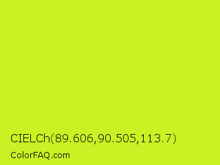 CIELCh 89.606,90.505,113.7 Color is a normal lime color and the nearest color is Pear #d1e231. Hex code #c9f124 and RGB value is rgb(201,241,36). In RGB color space, this color is composed of 79% red, 95% green, 14% blue, In CMYK color space, this color is composed of 17% cyan, 0% magenta, 85% yellow , 5% black , In HSL color space, this color has a hue angle of 72° , 88% saturation and 54% lightness.