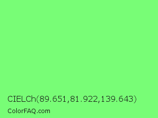 CIELCh 89.651,81.922,139.643 Color is a light green color and the nearest color is Screamin Green #66ff66. Hex code #78fd76 and RGB value is rgb(120,253,118). In RGB color space, this color is composed of 47% red, 99% green, 46% blue, In CMYK color space, this color is composed of 53% cyan, 0% magenta, 53% yellow , 1% black , In HSL color space, this color has a hue angle of 119° , 97% saturation and 73% lightness.