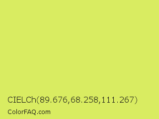 CIELCh 89.676,68.258,111.267 Color is a light yellow color and the nearest color is Booger Buster #dde26a. Hex code #d9ec61 and RGB value is rgb(217,236,97). In RGB color space, this color is composed of 85% red, 93% green, 38% blue, In CMYK color space, this color is composed of 8% cyan, 0% magenta, 59% yellow , 7% black , In HSL color space, this color has a hue angle of 68° , 79% saturation and 65% lightness.