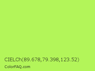 CIELCh 89.678,79.398,123.52 Color is a light green color and the nearest color is Inchworm #b2ec5d. Hex code #b3f559 and RGB value is rgb(179,245,89). In RGB color space, this color is composed of 70% red, 96% green, 35% blue, In CMYK color space, this color is composed of 27% cyan, 0% magenta, 64% yellow , 4% black , In HSL color space, this color has a hue angle of 85° , 89% saturation and 65% lightness.