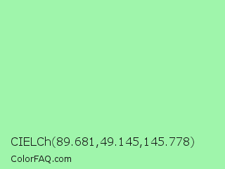 CIELCh 89.681,49.145,145.778 Color is a light green color and the nearest color is Teal Deer #99e6b3. Hex code #9ff5ab and RGB value is rgb(159,245,171). In RGB color space, this color is composed of 62% red, 96% green, 67% blue, In CMYK color space, this color is composed of 35% cyan, 0% magenta, 30% yellow , 4% black , In HSL color space, this color has a hue angle of 128° , 81% saturation and 79% lightness.