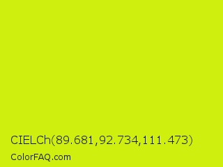 CIELCh 89.681,92.734,111.473 Color is a normal yellow color and the nearest color is Las Palmas #c6e610. Hex code #cff00e and RGB value is rgb(207,240,14). In RGB color space, this color is composed of 81% red, 94% green, 5% blue, In CMYK color space, this color is composed of 14% cyan, 0% magenta, 94% yellow , 6% black , In HSL color space, this color has a hue angle of 69° , 89% saturation and 50% lightness.