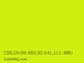 CIELCh 89.683,92.641,111.488 Color is a normal yellow color and the nearest color is Las Palmas #c6e610. Hex code #cff00f and RGB value is rgb(207,240,15). In RGB color space, this color is composed of 81% red, 94% green, 6% blue, In CMYK color space, this color is composed of 14% cyan, 0% magenta, 94% yellow , 6% black , In HSL color space, this color has a hue angle of 69° , 88% saturation and 50% lightness.