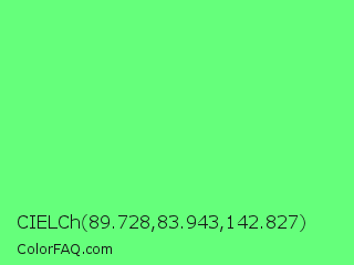 CIELCh 89.728,83.943,142.827 Color is a light green color and the nearest color is Screamin Green #66ff66. Hex code #65ff7b and RGB value is rgb(101,255,123). In RGB color space, this color is composed of 40% red, 100% green, 48% blue, In CMYK color space, this color is composed of 60% cyan, 0% magenta, 52% yellow , 0% black , In HSL color space, this color has a hue angle of 129° , 100% saturation and 70% lightness.